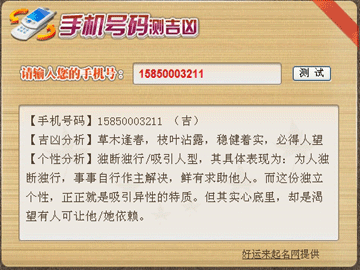手机号手机号码测吉凶测试打分通过手机号测吉凶是一种流行的方法,通过分析手机号码的数字组合,评估其可能带来的运势。这种方法基于数字能量学等理论,认为不同数字组合会影响个人运势。测试结果仅供参考,不可完全依赖。如需了解更多,建议咨询相关专家。... 2025-09-22 - [阅读全文]